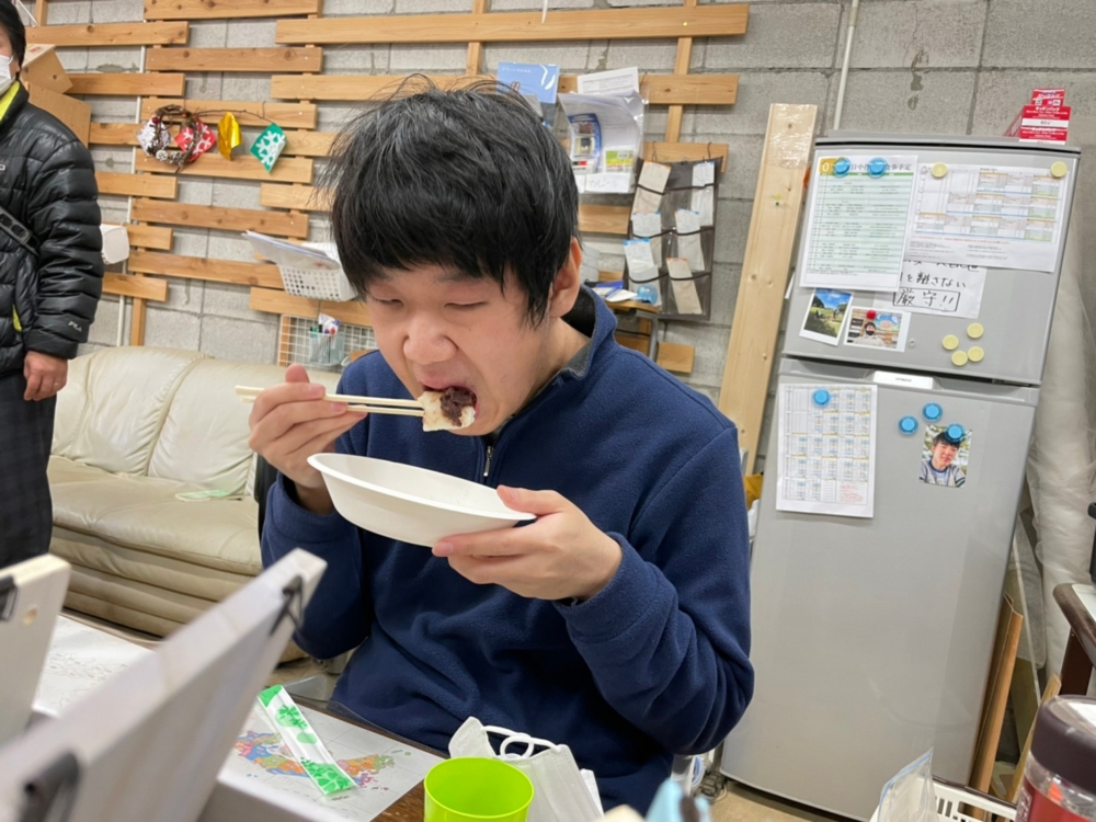 お餅をおやつに頂きました。人気は納豆餅だそうです。